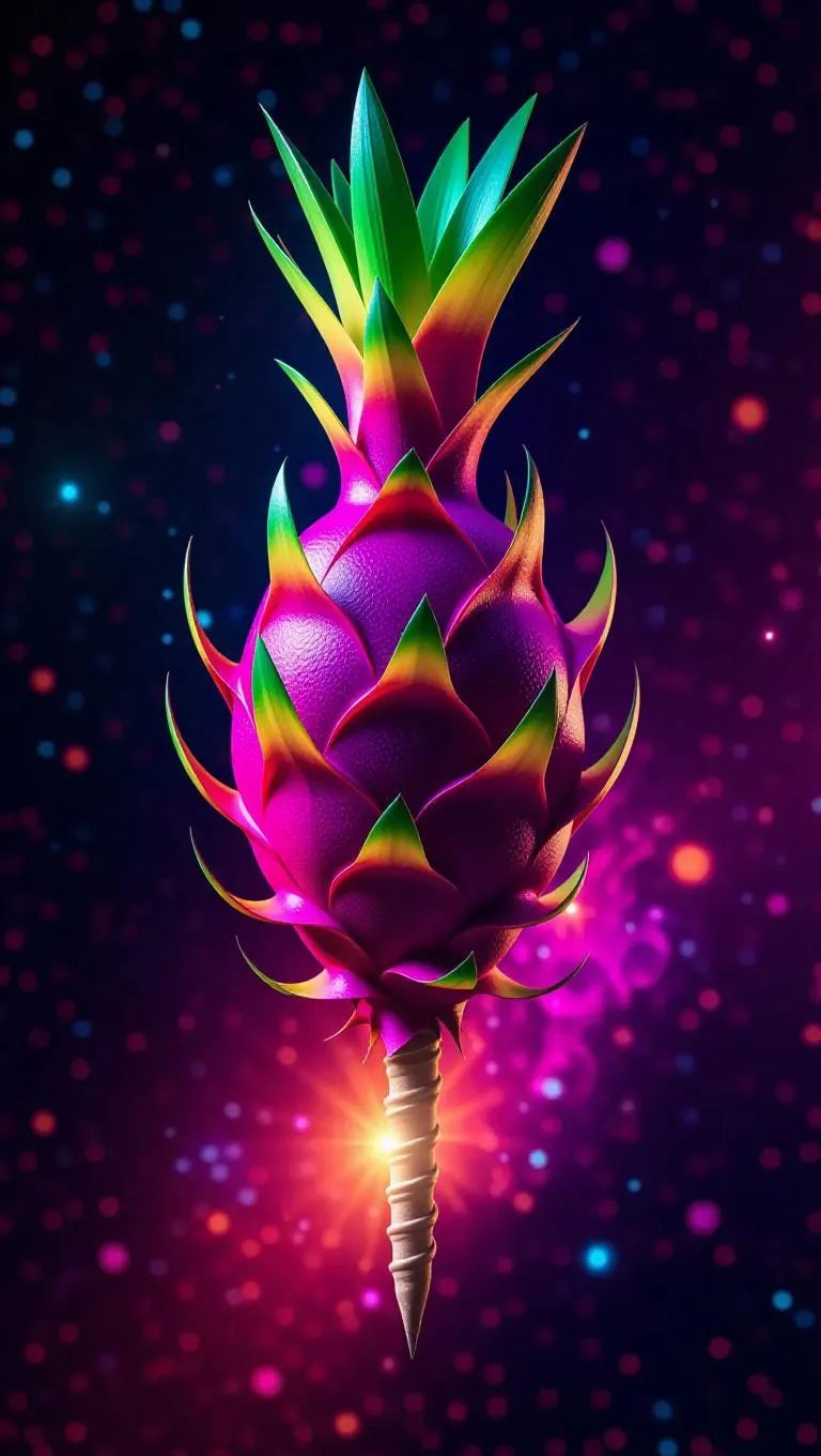 Spear with dragonfruit head, vibrant cosmic style, flowing patterns, radiant energy, bright colors, space glow, complex designs, stellar flair, avant-garde elements, mystical presence