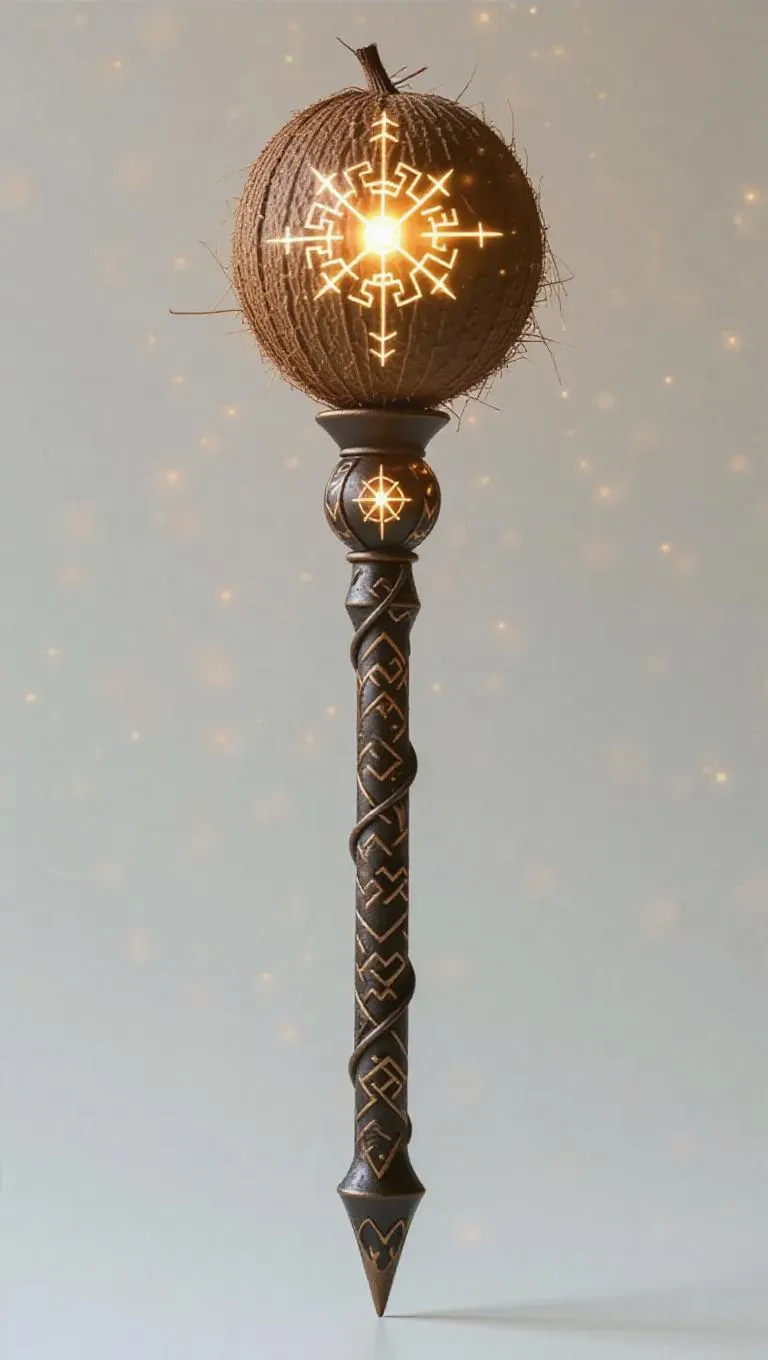 Magical staff adorned with intricate runes, topped by a glowing floating coconut orb, soft white background, ethereal glow, whimsical flair, detailed craftsmanship, serene atmosphere.