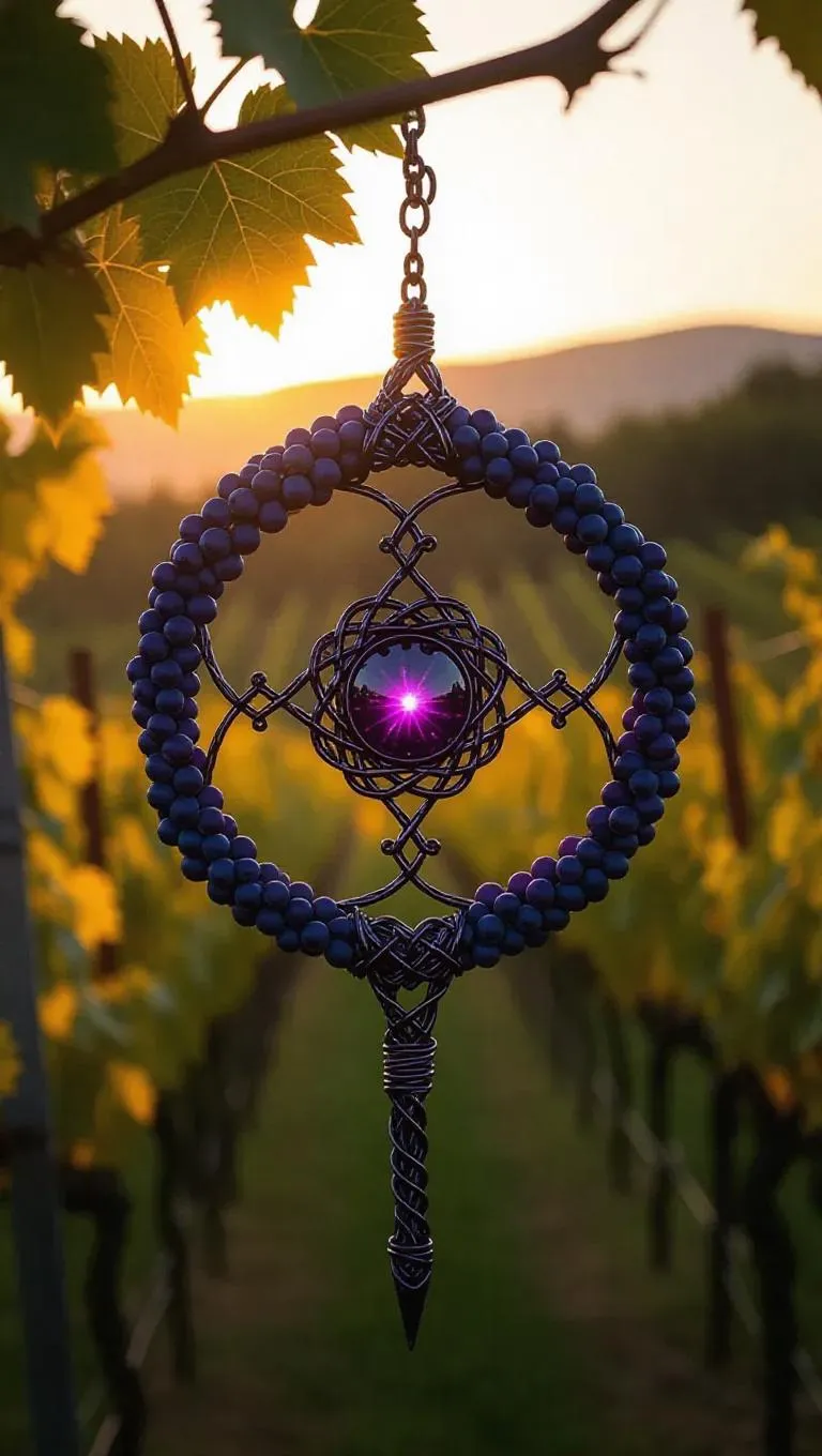 A chakram intricately woven from grape vines and clusters, with a deep, purple core shimmering with a mystical, twilight glow. The circular and elegant design is set against a vineyard at dusk, where the fading sunlight casts a warm, golden hue over the rolling hills and lush vines, enhancing the weapon's enchanting and versatile power. Soft, diffused light highlights the intricate details, creating a serene yet powerful atmosphere. Style: Mystical realism.