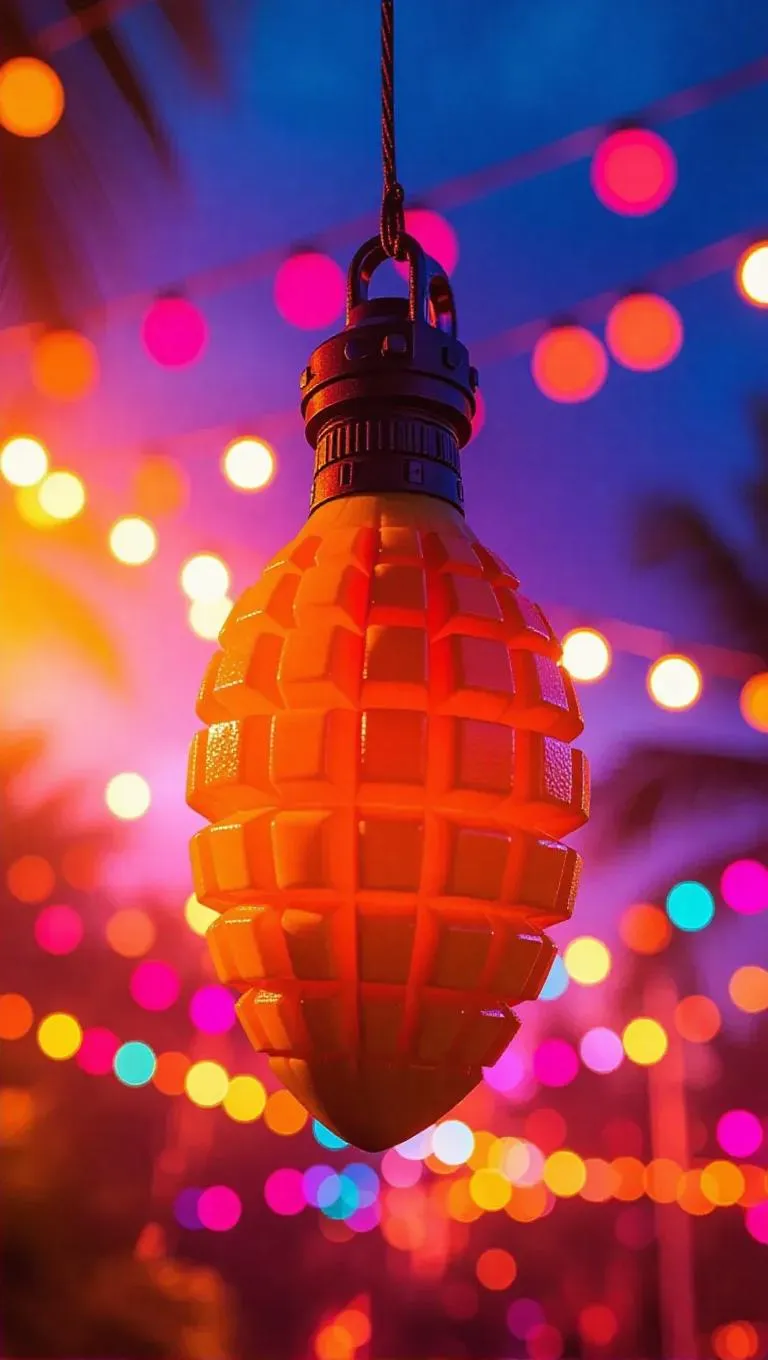 A deep orange grenade, crafted from the fibrous pit of a mango, radiates a warm, golden glow. Set against a vibrant carnival backdrop, the grenade's tropical origins and explosive energy are highlighted by the colorful lights casting long shadows and reflecting off the festive decorations. The sky is a blend of bright oranges and purples, enhancing the grenade's vibrant color and creating a joyful, exuberant atmosphere. The scene is captured with a soft, diffused light, emphasizing the natural beauty and tension. Style: Realistic.