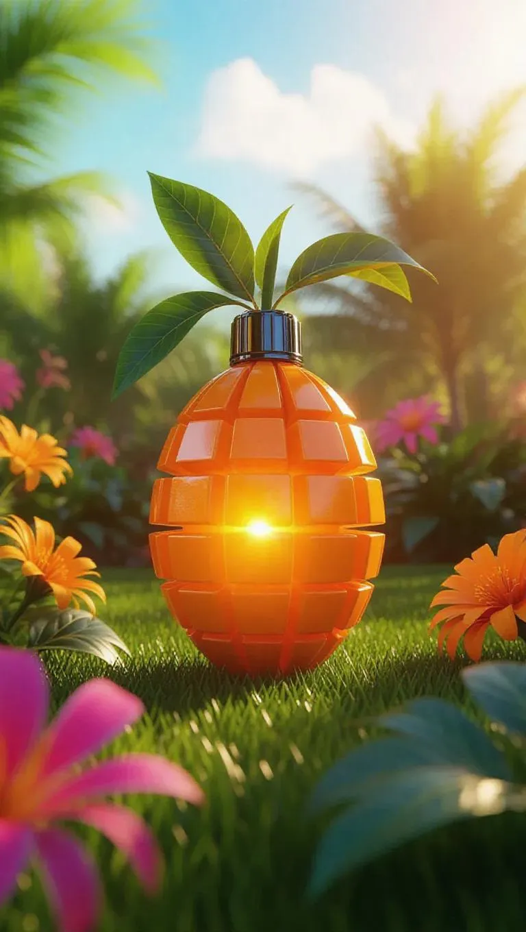 A deep orange grenade, crafted from the fibrous pit of a mango, radiates a warm, golden glow. Set against a vibrant tropical garden, the grenade's tropical origins and explosive energy are highlighted by the soft, dappled sunlight casting long shadows and reflecting off the colorful flowers. The sky is a blend of bright blues and whites, enhancing the grenade's vibrant color and creating a lively, cheerful atmosphere. The scene is captured with a soft, diffused light, emphasizing the natural beauty and tension. Style: Realistic.