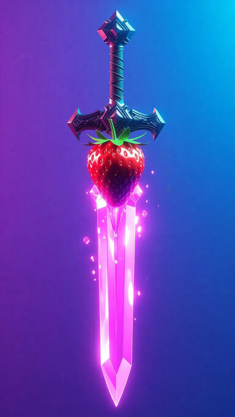 Strawberry sword with a crystal-like blade, glowing aura effects, elaborate design, sleek and modern, set against a cool gradient background, emphasizing the weapon's elegance and otherworldly presence.
