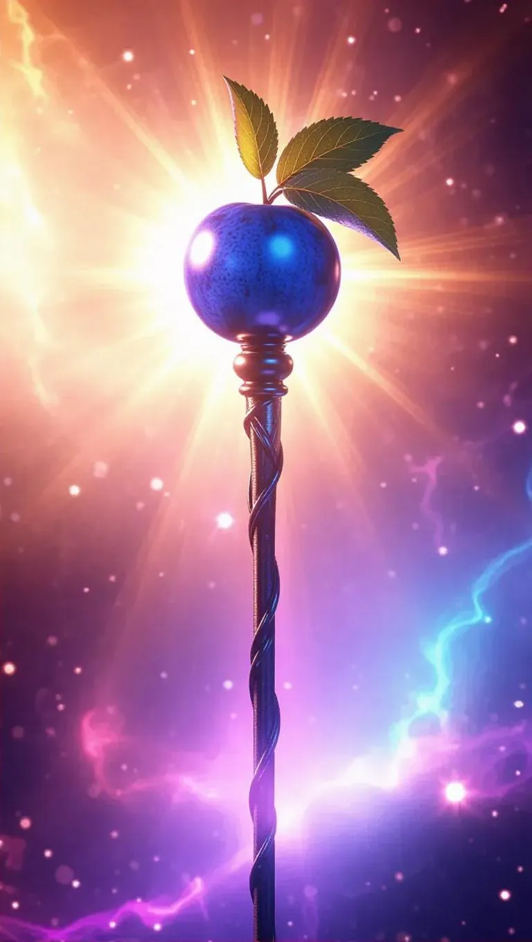 A mystical magic staff topped with a glowing blueberry, surrounded by radiant sunbeams, set against a backdrop of swirling cosmic energy, creating a warm and inviting atmosphere.