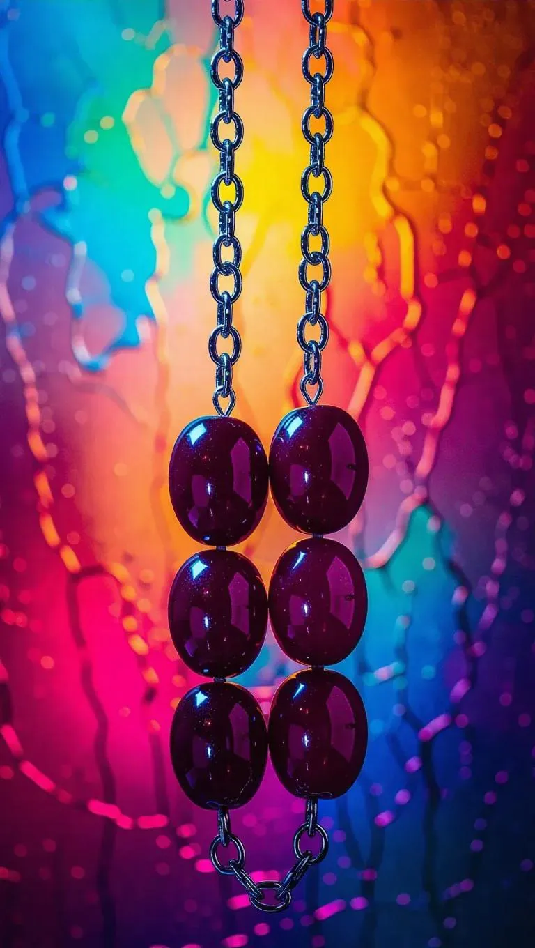 A pair of nunchucks crafted from vibrant, glossy plums, connected by an elegant, silver chain, set against an abstract artistic background, exuding a blend of whimsy and precision, perfect for concept art.