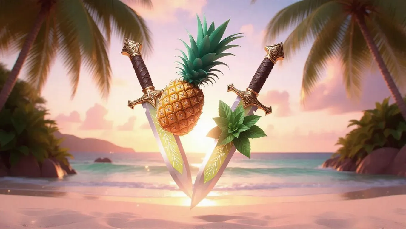 Dual daggers inspired by pineapples and mint leaves, floating composition, intricate blade designs with swirling pineapple patterns and mint leaf engravings, ethereal glow, set against a soft, dreamy background with subtle hints of island paradise.