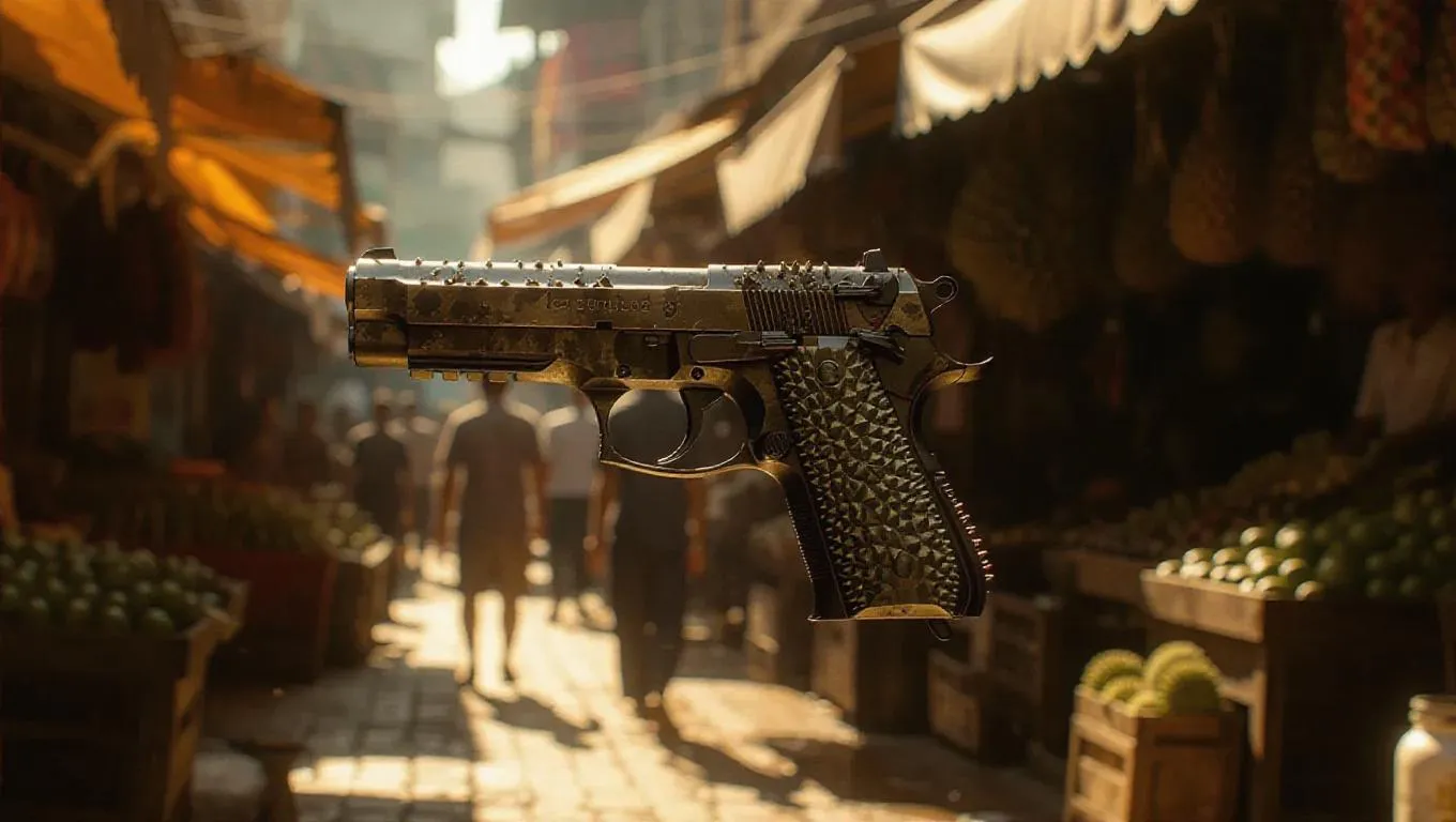 A handgun forged from the dense, spiky exterior of a durian, exuding a pungent yet powerful aura. The pistol's minimalist and streamlined design stands out against a bustling market scene backdrop. Soft, bright sunlight filters through the awnings, casting playful shadows and highlighting the weapon's intricate details. The scene is rendered in a hyper-realistic style, emphasizing the contrast between nature and technology.