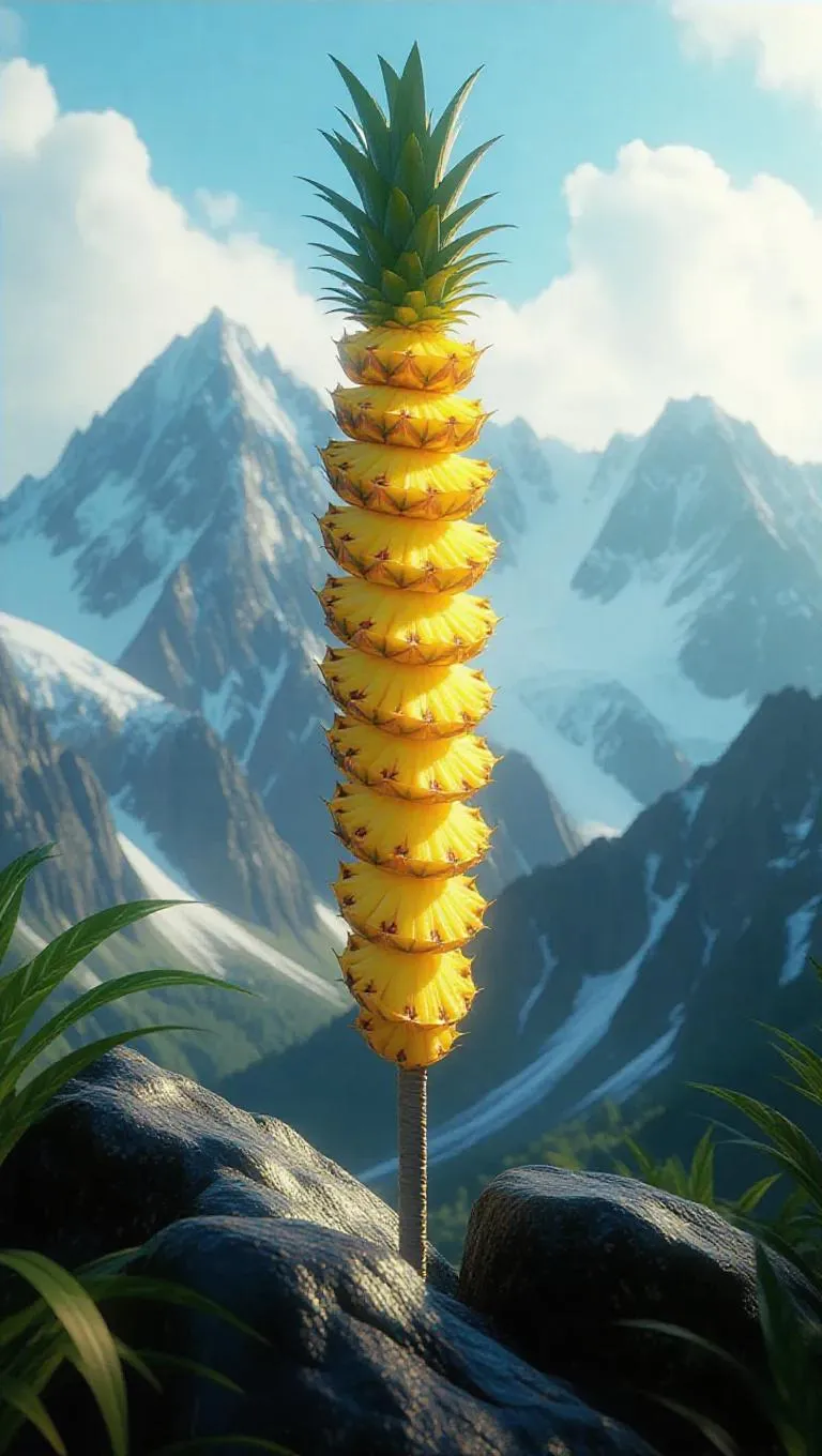 A spear meticulously crafted from overlapping pineapple slices, with a bright, yellow core that emits a tropical, invigorating glow. The spear's sleek, streamlined design emphasizes its organic yet deadly precision. Set against a mountainous backdrop, the rugged peaks and clear skies enhance the spear's natural elegance. Soft, diffused sunlight filters through the mountain air, casting gentle shadows and highlighting the spear's intricate details. The style is a blend of organic realism and surrealism, creating a visually striking and unique image.