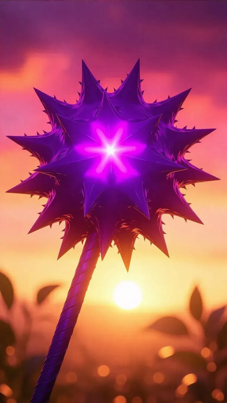 A flail made from spiky starfruit slices, with a bright, purple core glowing warmly, exudes a chaotic and energetic design. Set against a dramatic sunset background, the scene emphasizes the flail’s lively spirit. Soft, warm sunlight bathes the scene, casting gentle highlights and shadows that enhance the dynamic feel. The style is realistic, with a touch of whimsical fantasy.