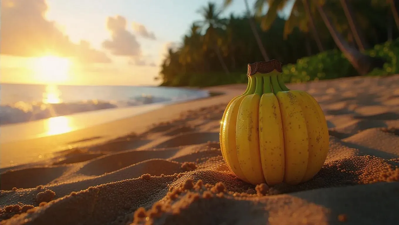 A grenade shaped from clusters of yellow bananas, cheerful yellow and gleaming in the afternoon light, rests against a tropical beach at sunset. The beach's golden sands and warm shades of twilight highlight the grenade's elegant yet explosive design. Soft, orange light washes over the scene, casting playful shadows and enhancing the banana grenade's bright color. The image style is tropical, capturing the intricate details of the bananas and the exotic beauty of the beach.