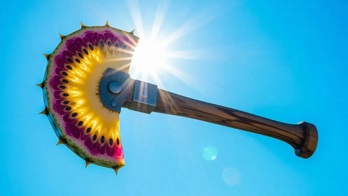 A large battle axe with a passion fruit slice-shaped blade, illuminated by a bright mid-morning sun, casting crisp shadows and emphasizing the intricate details of the blade. The axe is positioned against a clear blue sky, creating an optimistic and lively atmosphere.