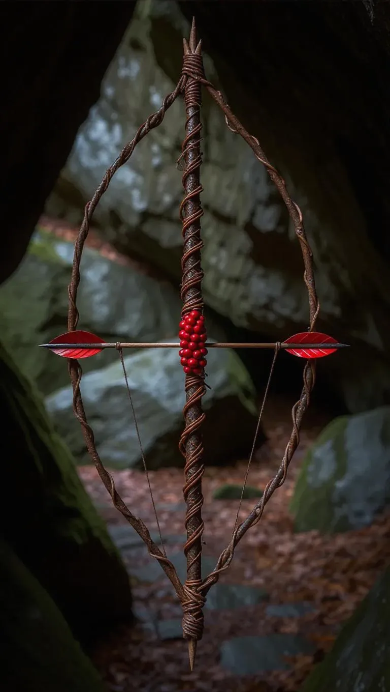 A unique bow crafted from intricately twisted vine branches, paired with arrows tipped with striking, crimson seeds, set against a dark cave backdrop, exuding a blend of ancient magic and wild beauty.