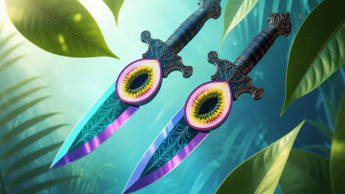 Dual daggers inspired by passionfruit and bay leaves, floating composition, intricate blade designs with swirling passionfruit patterns and bay leaf engravings, ethereal glow, set against a soft, dreamy background with subtle hints of jungle.