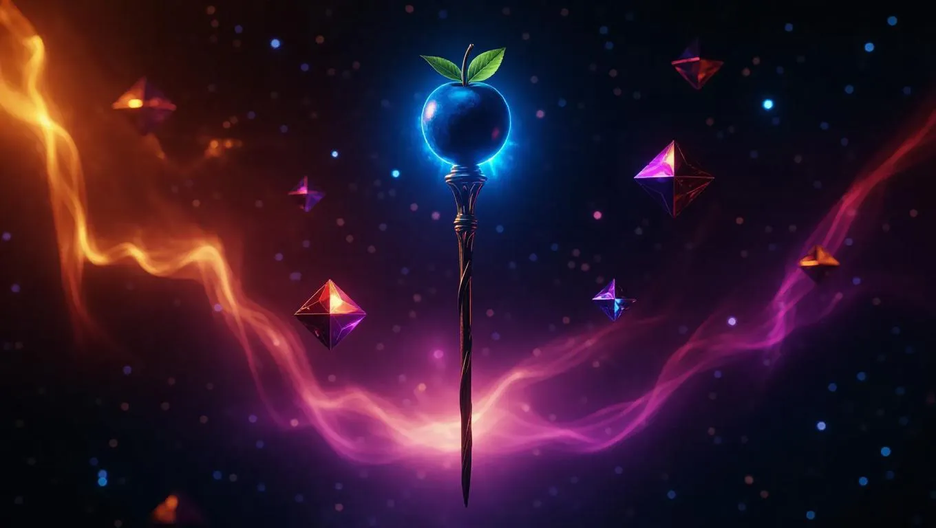 A mystical magic staff topped with a glowing blueberry, surrounded by floating geometric shapes, set against a backdrop of swirling cosmic energy, creating a surreal and modern atmosphere.