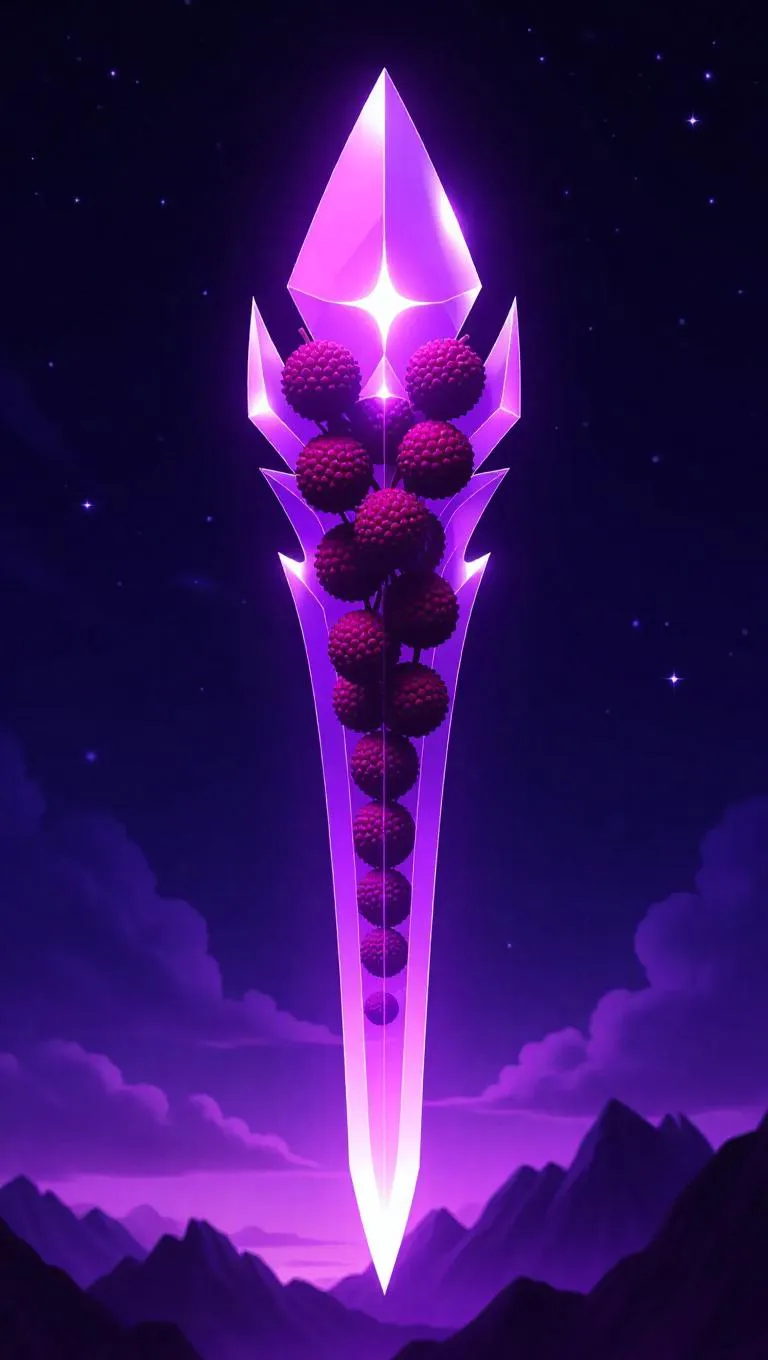 A glaive crafted from overlapping lychee segments, with a translucent, white core that emits a soft, celestial glow. The weapon has an elegant, elongated design, set against a starry night sky that enhances its otherworldly beauty. The scene is bathed in cool, ambient light, with stars twinkling in the background. The style is fantastical, blending realism with ethereal elements.