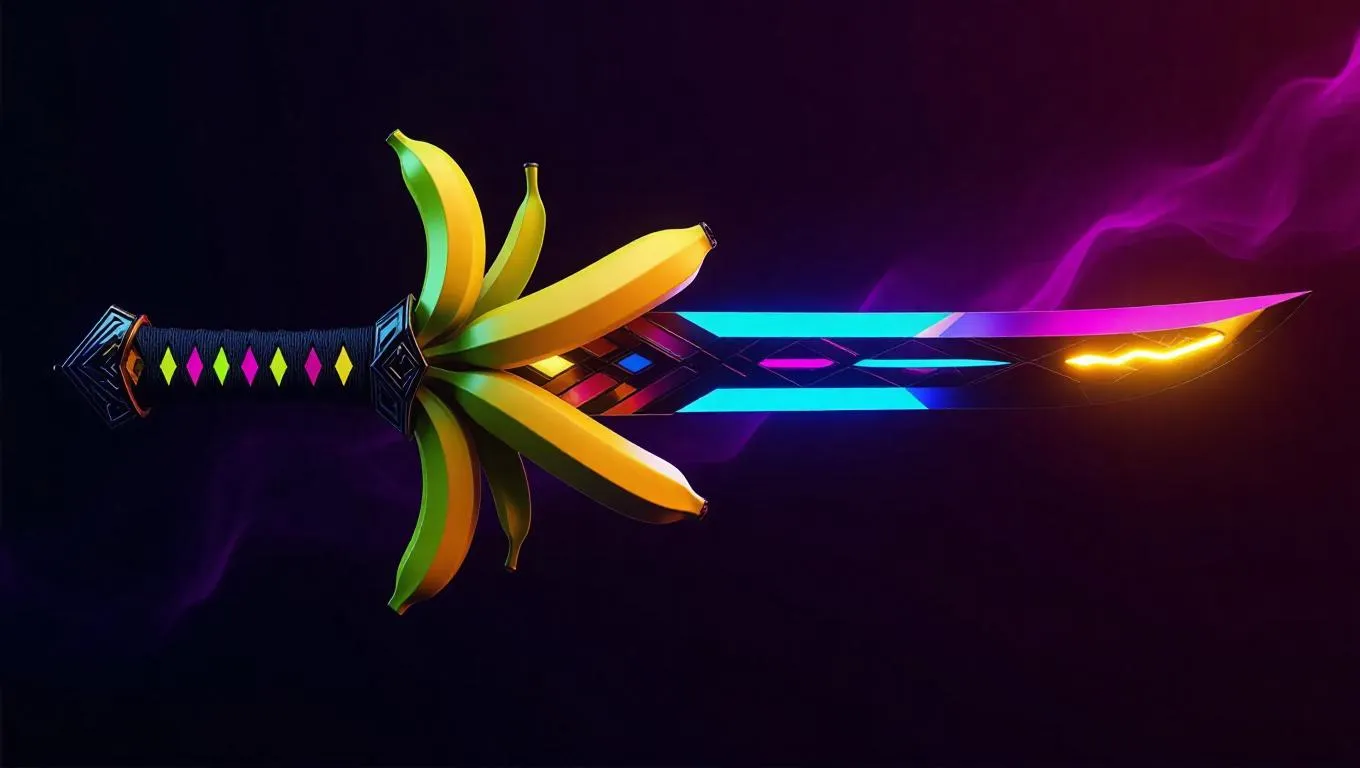 Stylized concept art of a sword hilt crafted from banana peel, geometric detailing, vivid colors, sci-fi flair, contrasting textures, sharp and sleek design, glowing accents, set against a dark, cosmic background
