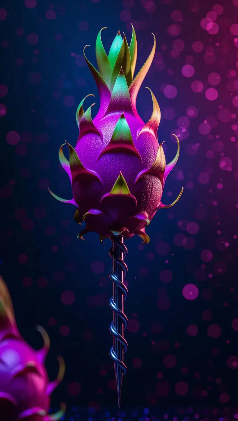 Spear with dragonfruit head, luminous style, dazzling patterns, ethereal energy, vivid tones, cosmic illumination, artistic designs, celestial essence, futuristic components, magical aura