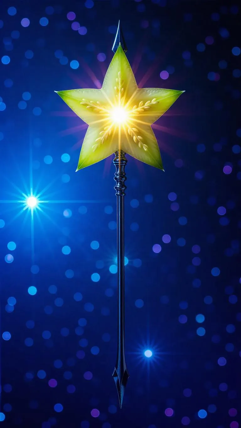 Spear with starfruit blade, tranquil radial glow, ethereal soft background, luminescent starry details, mystical ambiance