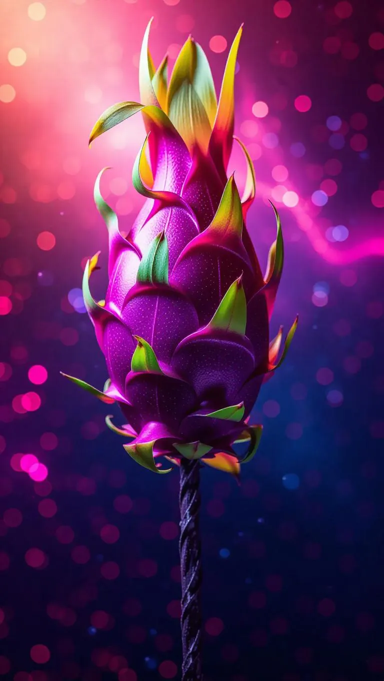 Spear with dragonfruit head, celestial style, shimmering patterns, ethereal energy, vibrant hues, galactic glow, detailed designs, cosmic flair, advanced elements, mystical essence
