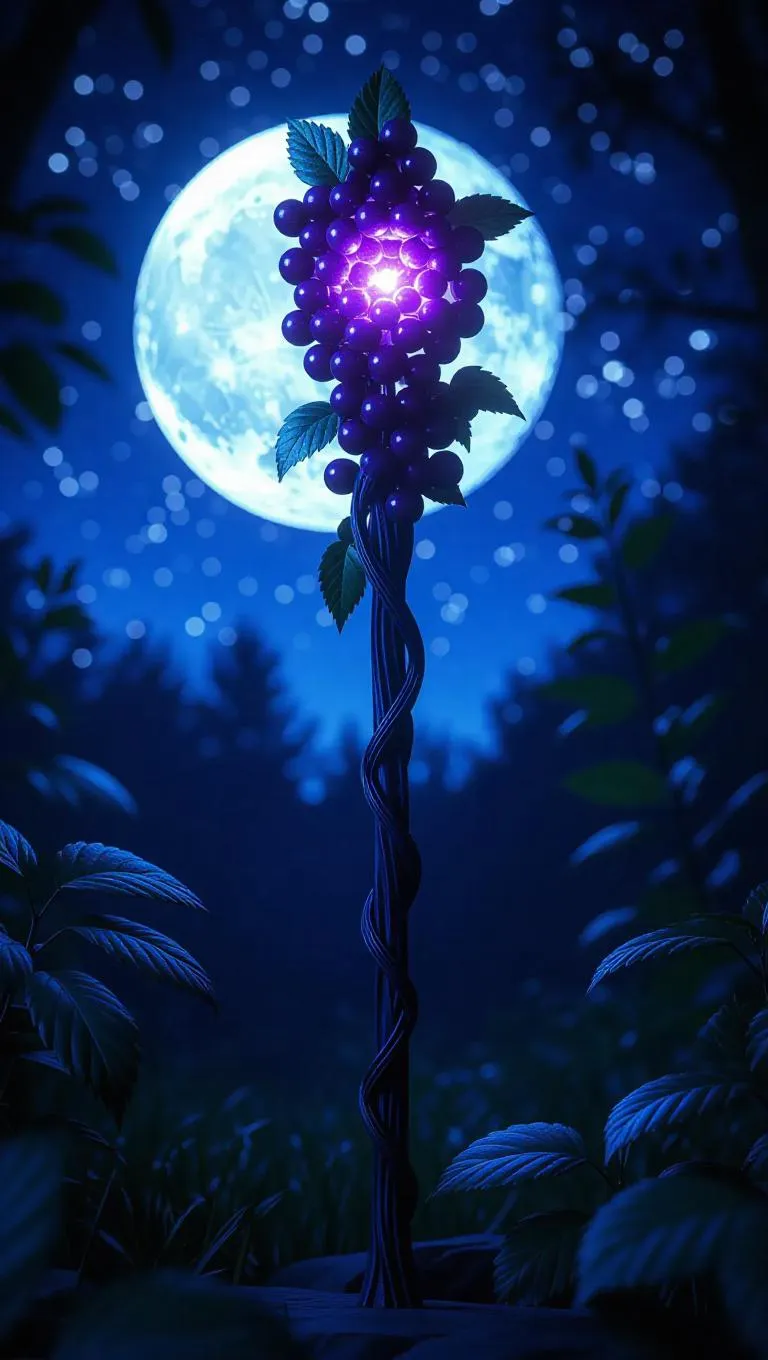 A staff intricately carved from succulent berry medley slices, with a vibrant, glowing lavender core that radiates a soft, whimsical light. The staff's sleek and mystical design stands out against a serene and tranquil moonlit background, enhancing its organic elegance. Soft, diffused star light sparkles in the sky, casting gentle, soft shadows and highlighting the staff’s intricate details. The scene exudes a serene, dreamlike beauty, capturing the essence of a mystical, enchanted night.