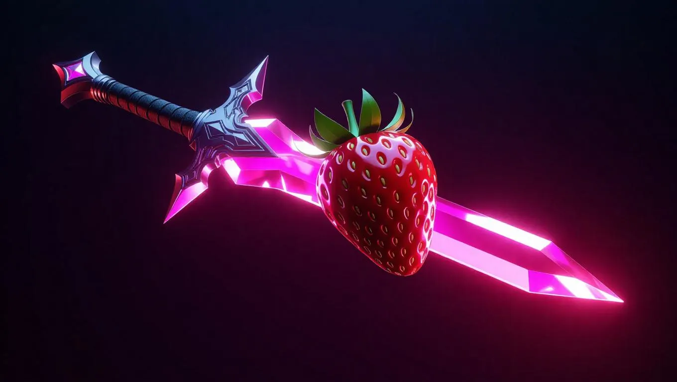 Strawberry sword with a jagged blade, glowing aura effects, minimalist design, sleek and modern, set against a dramatic gradient background, emphasizing the weapon's elegance and otherworldly presence.