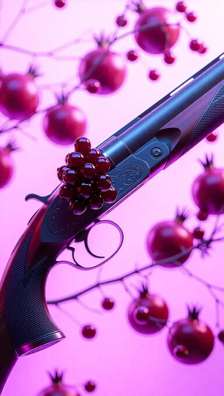 A sleek silver metal shotgun intricately decorated with plump pomegranates, glowing under a gentle lavender ambient light, creating a surreal and captivating contrast between the weapon's cold metal and the organic, vibrant berries.