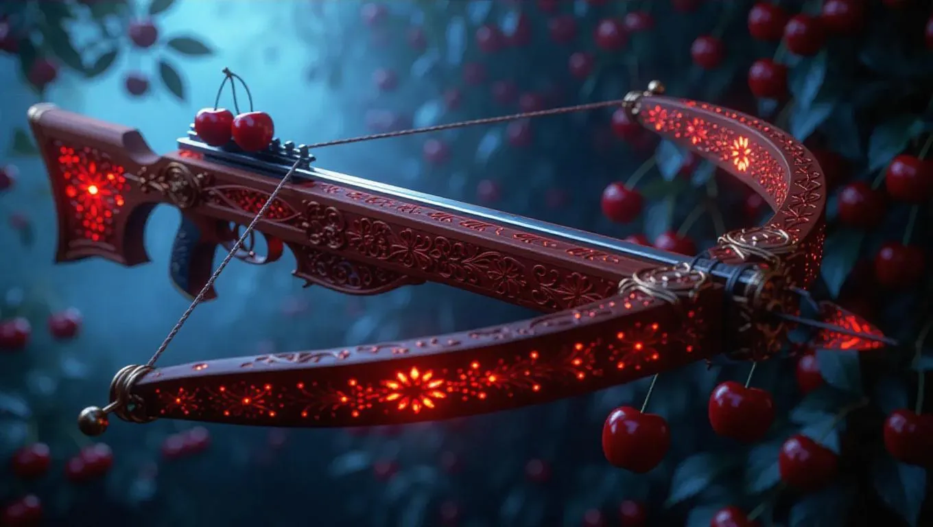 A crossbow intricately crafted from cherry wood and adorned with cherries, emitting a soft, ethereal red glow, set against a mystical backdrop with delicate floral patterns and shimmering light effects, enhancing the weapon's enchanting and unique design