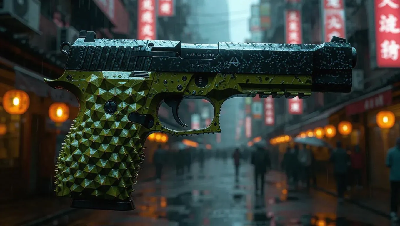 A handgun forged from the dense, spiky exterior of a durian, exuding a pungent yet powerful aura. The pistol's compact and powerful design stands out against a futuristic cityscape backdrop. Soft, ambient lights illuminate the buildings, casting soft shadows and highlighting the weapon's intricate details. The scene is rendered in a hyper-realistic style, emphasizing the contrast between nature and technology.