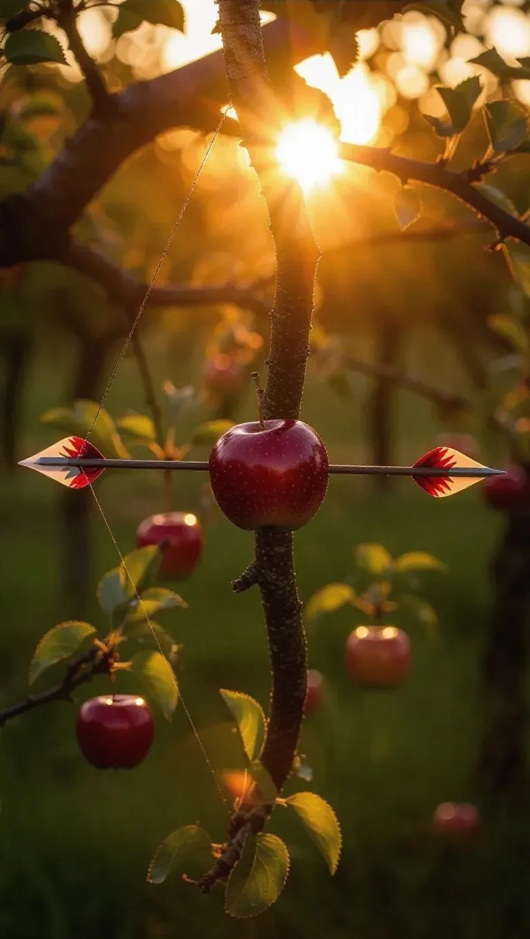 A unique bow crafted from artfully twisted apple branches, paired with arrows tipped with bright, ruby seeds, set against a sun-drenched orchard backdrop, exuding a blend of ancient magic and fruitful beauty.