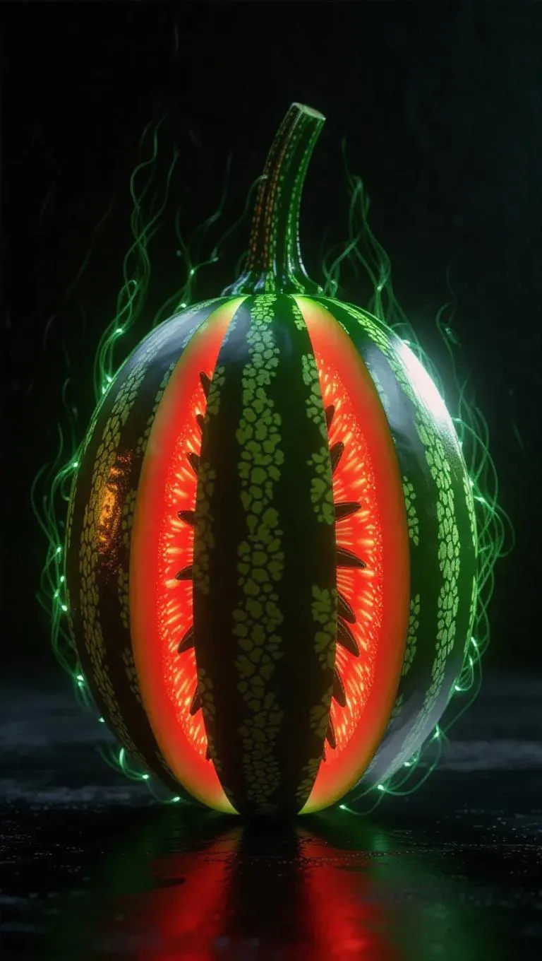 A grenade crafted from a watermelon, detailed texture with green rind and red flesh, enveloped in a glowing watermelon energy aura, set against a dark background, emphasizing the surreal and vibrant nature of the fruit.