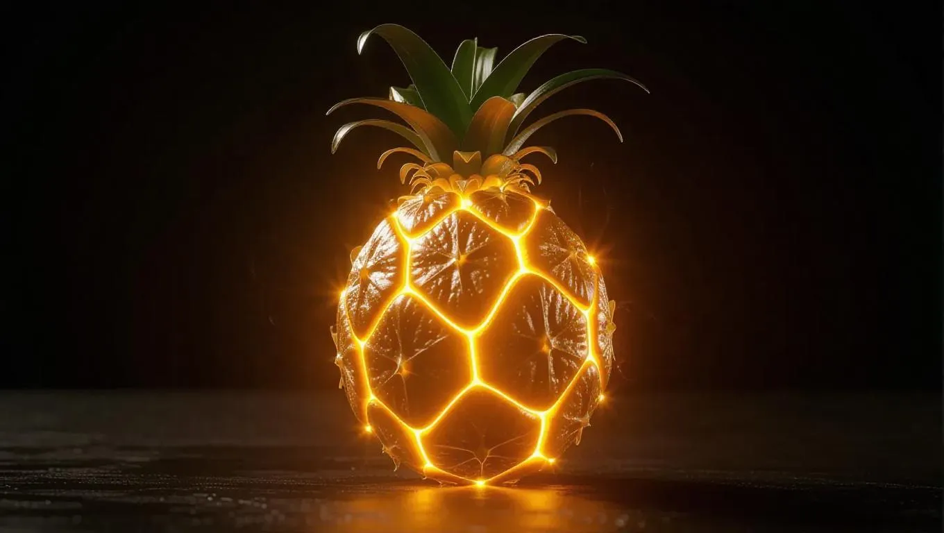 A grenade crafted from a passion fruit, detailed texture with rough outer skin and bright yellow pulp, enveloped in a glowing golden energy aura, set against a dark background, emphasizing the surreal and vibrant nature of the fruit.