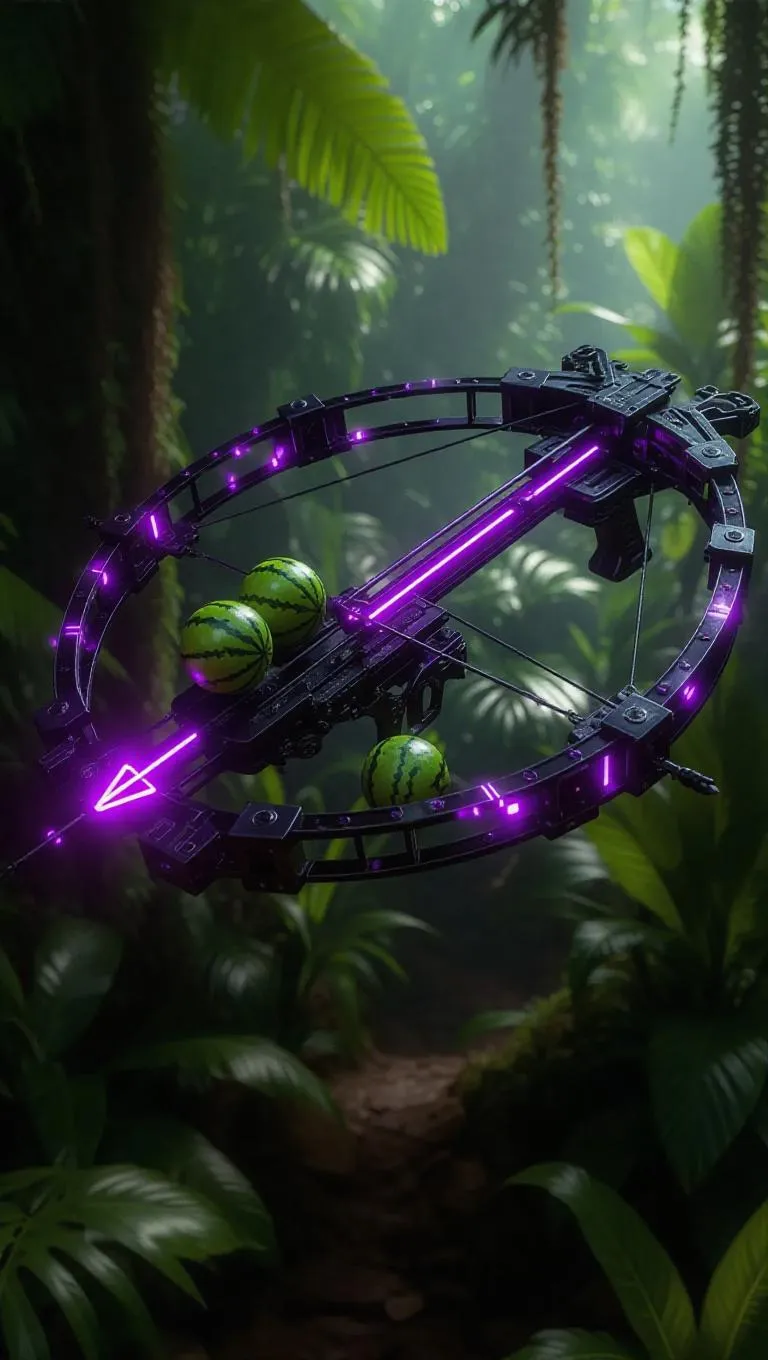 A crossbow with transparent limbs and a purple glow, shooting melons with precision, set against a lush jungle backdrop, creating an adventurous and vibrant atmosphere