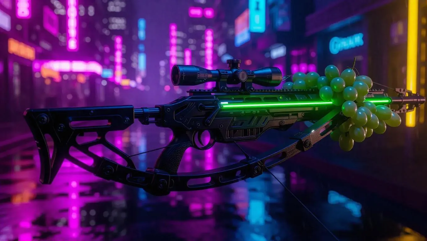 A futuristic crossbow with sleek lines and a neon green glow, shooting grapes with precision, set against a high-tech city backdrop, creating a sci-fi and vibrant atmosphere