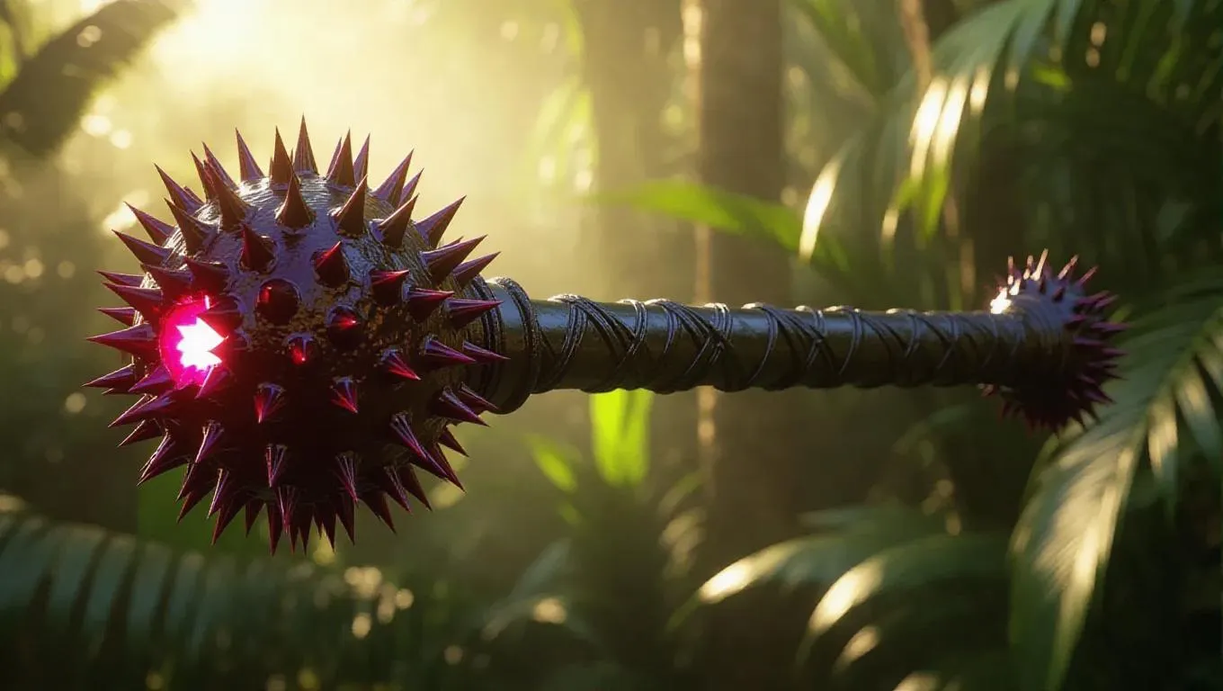 A mace forged from spiky rambutan segments, featuring a dark crimson core that pulses with a vibrant aura. The rugged and intimidating design is set against a lush tropical background, enhancing its fearsome presence. Soft, ambient light casts subtle shadows, highlighting the mace's textured surface. The style is exotic fantasy, emphasizing the weapon's lavish and menacing nature.