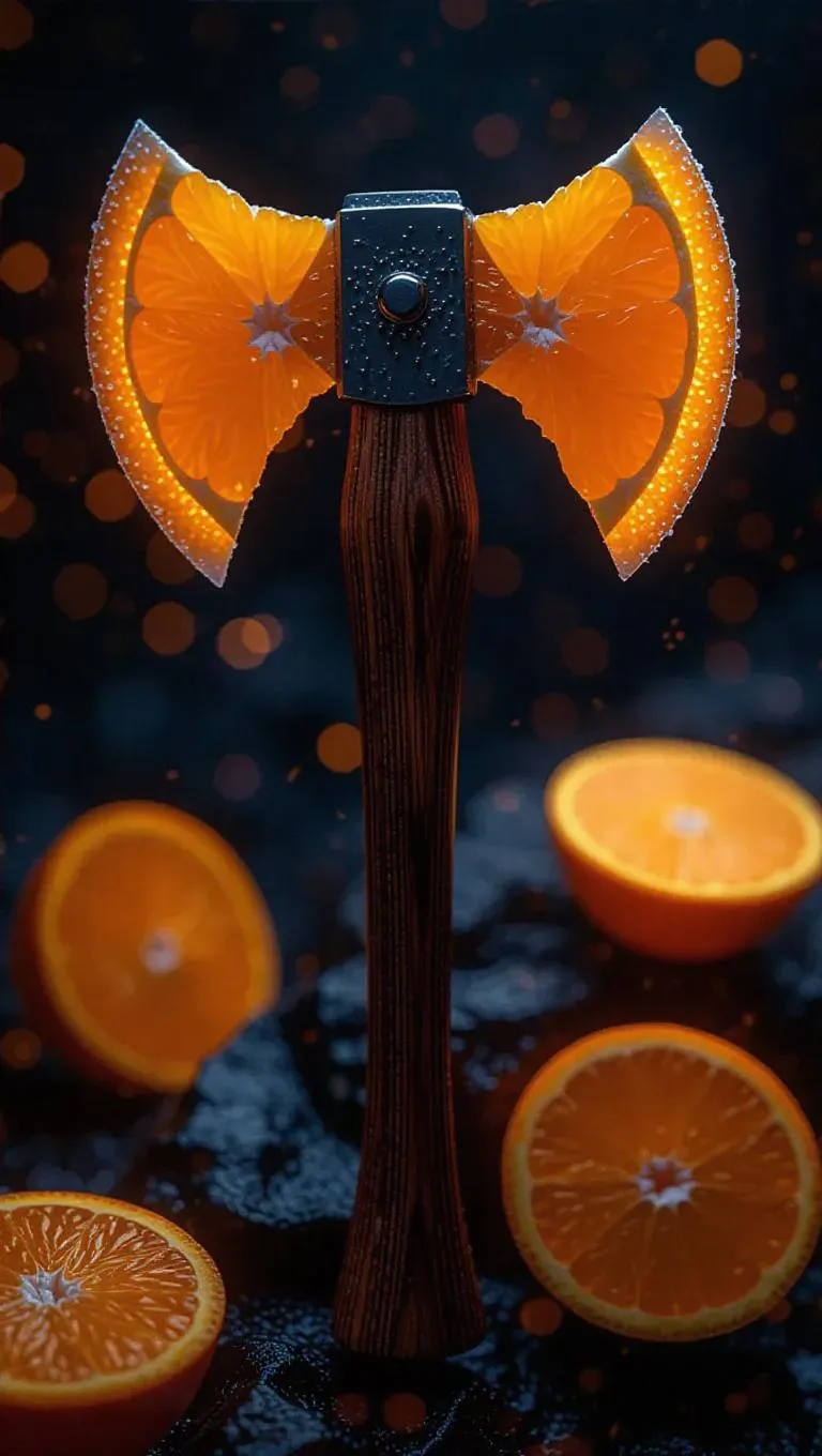 Axe crafted from frozen orange slices, shimmering with icy frost particles, glowing with a cold, ethereal light, set against a dark, mystical background, capturing the essence of frosty magic.