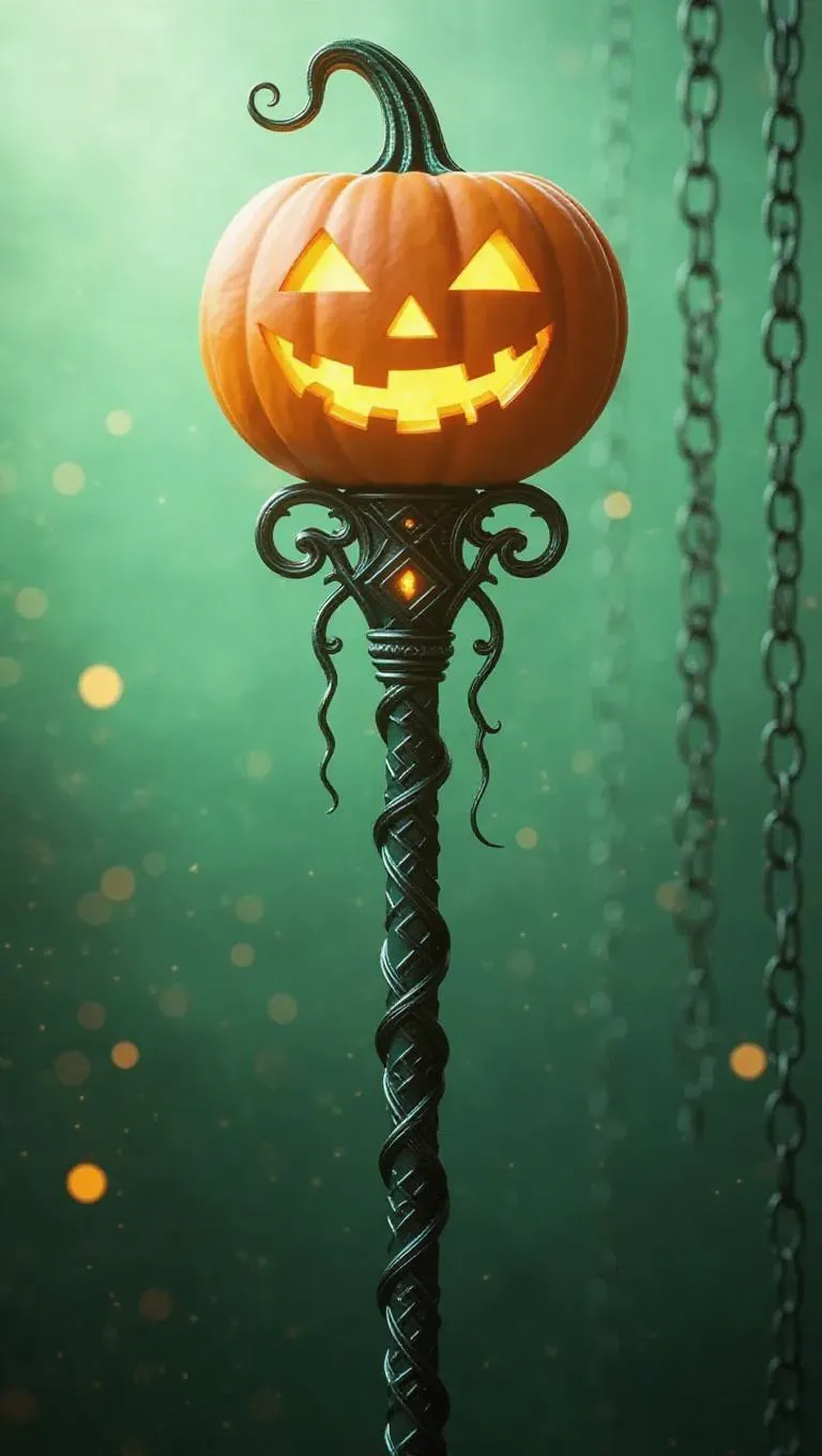 Magical staff adorned with intricate runes, topped by a glowing floating pumpkin orb, soft green background, ethereal glow, whimsical flair, detailed craftsmanship, serene atmosphere.