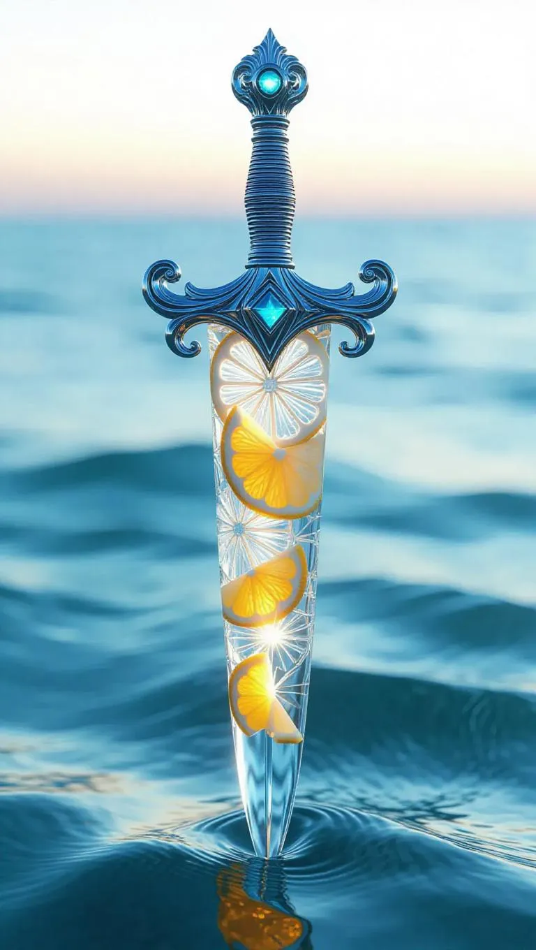 A dagger meticulously carved from translucent citrus slices, featuring a shimmering silver core that radiates a soft, cool glow. The intricate and delicate design is set against a tranquil ocean background, enhancing its ethereal and elegant appearance. The lighting is soft and ambient, surrounding the dagger’s translucency and silver core, creating a peaceful and magical atmosphere. The style is whimsical and realistic, blending detailed craftsmanship with a serene, coastal aesthetic.