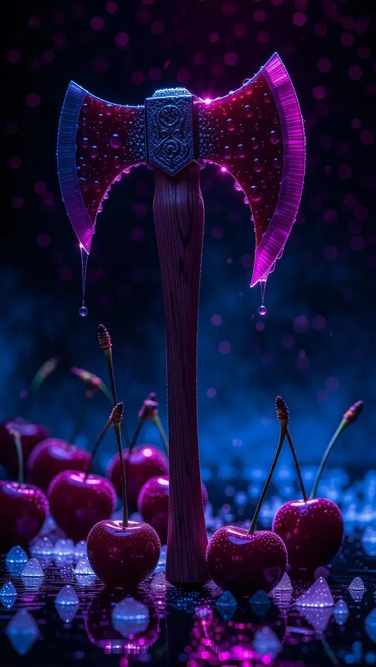 Axe crafted from frozen cherry slices, shimmering with icy frost particles, glowing with a cold, ethereal light, set against a dark, mystical background, capturing the essence of frosty magic.