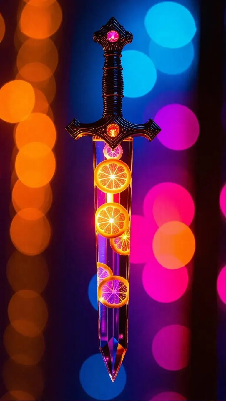 A dagger meticulously carved from translucent citrus slices, featuring a shimmering bronze core that radiates a soft, warm glow. The intricate and delicate design is set against a vivid, colorful background, enhancing its ethereal and elegant appearance. The lighting is bright, with harsh side light illuminating the dagger’s translucency and bronze core, creating a lively and magical atmosphere. The style is whimsical and realistic, blending detailed craftsmanship with a bright, cheerful aesthetic.