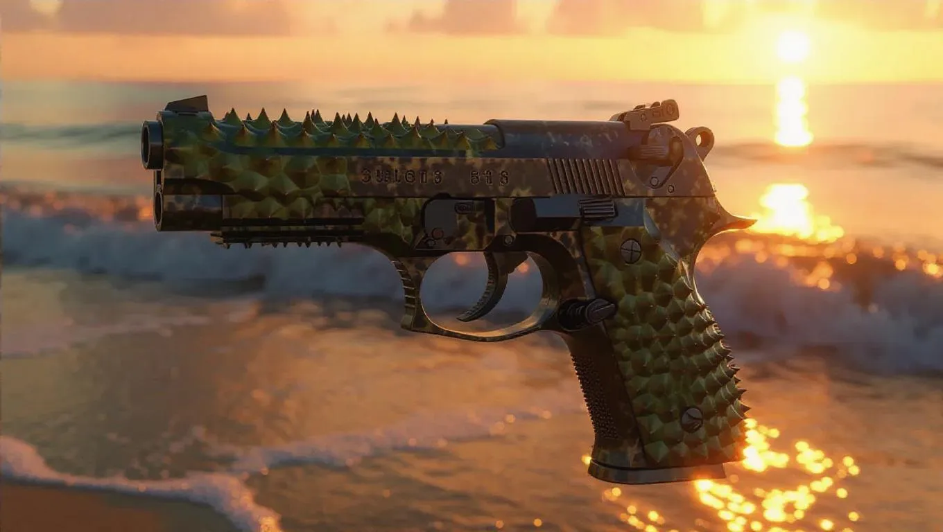 A handgun forged from the dense, spiky exterior of a durian, exuding a pungent yet powerful aura. The pistol's sleek and futuristic design stands out against a serene beach sunset backdrop. Soft, diffused sunlight glimmers off the ocean waves, casting reflections and highlighting the weapon's intricate details. The scene is rendered in a hyper-realistic style, emphasizing the contrast between nature and technology.