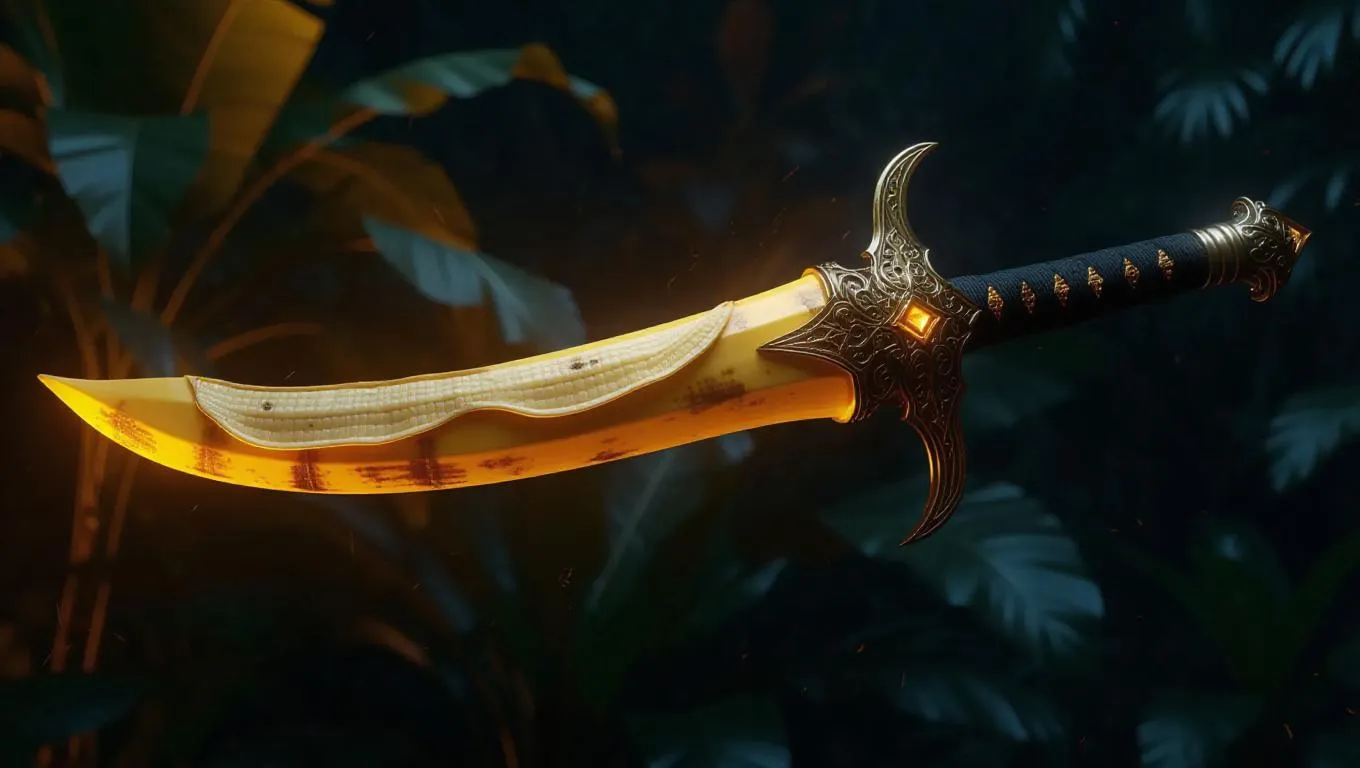 Stylized concept art of a sword hilt crafted from banana peel, intricate detailing, earth tones, fantasy flair, contrasting textures, nature-inspired design, glowing accents, set against a vibrantly dark background