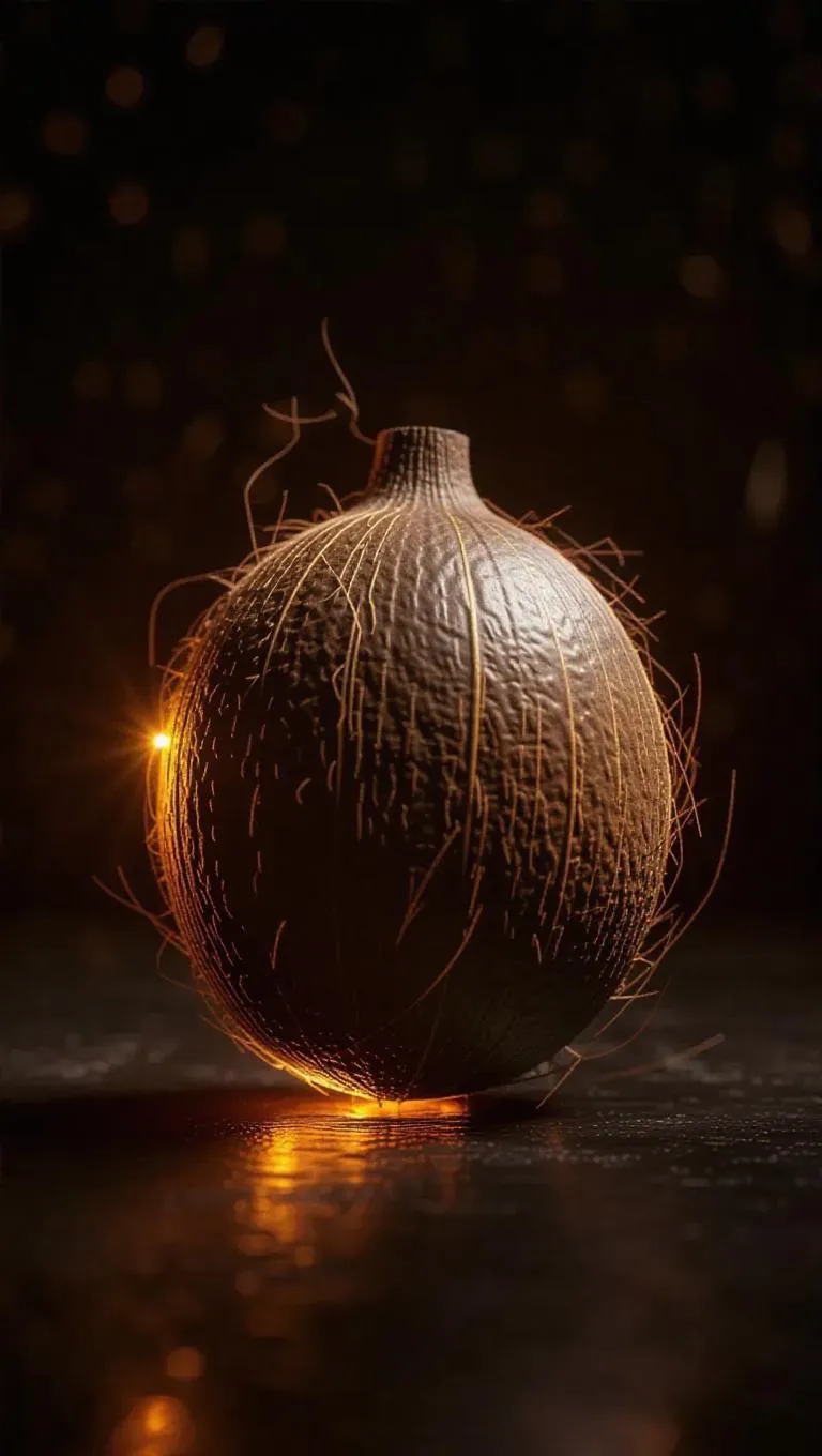 A grenade crafted from a coconut, detailed texture with rough husk and brown skin, enveloped in a glowing brown energy aura, set against a dark background, emphasizing the surreal and vibrant nature of the fruit.