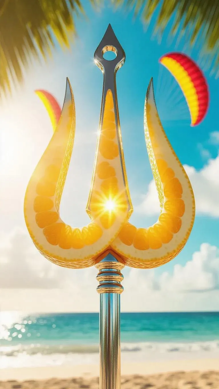 A trident intricately crafted from overlapping citrus fruit rings, featuring a vibrant, yellow core that crackles with zesty energy. The bold and dynamic design is set against a tropical beach background, with parasails soaring above and the sun casting warm, golden light. The scene exudes liveliness and invigoration, capturing the essence of a sunny, coastal paradise.
