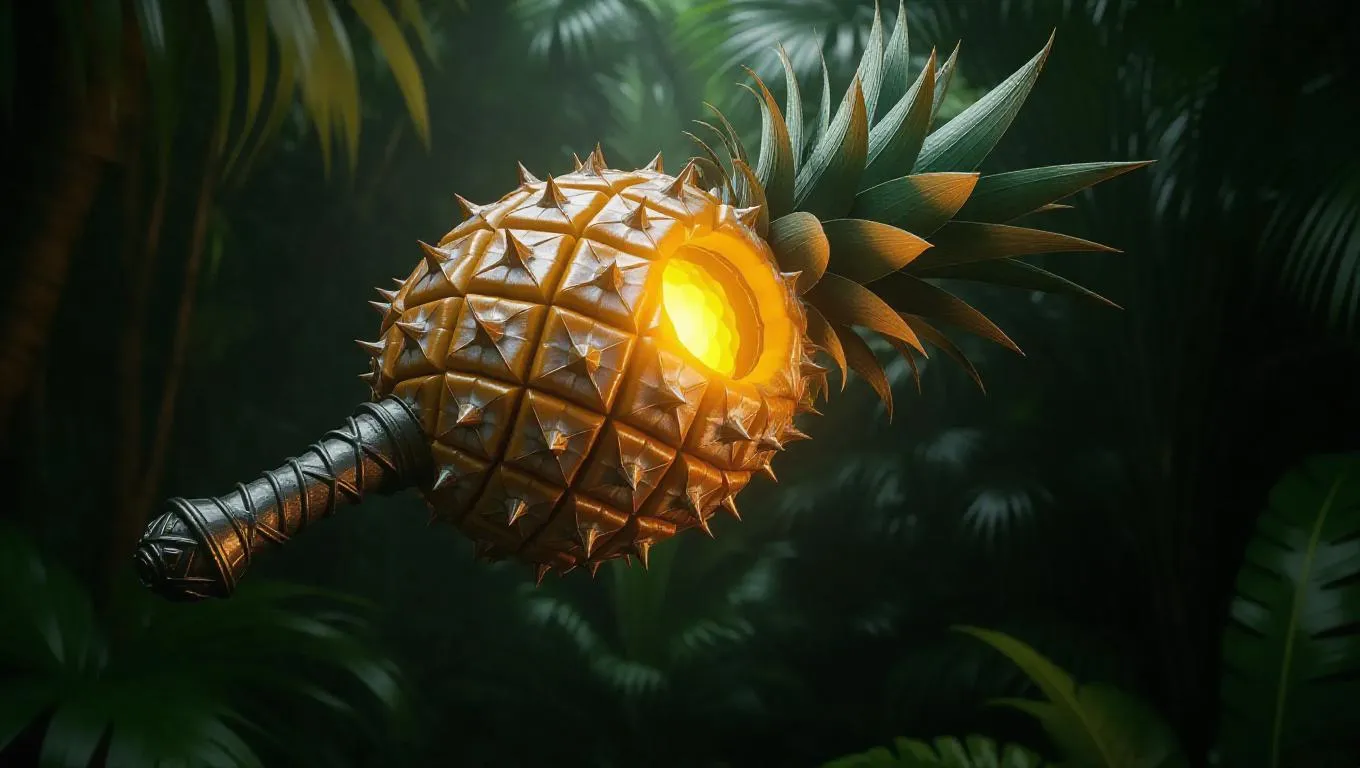 A mace forged from spiky pineapple segments, featuring a golden core that pulses with a warm aura. The rugged and intimidating design is set against a tropical jungle background, enhancing its fearsome presence. Soft, ambient light casts subtle shadows, highlighting the mace's textured surface. The style is adventure fantasy, emphasizing the weapon's vibrant and menacing nature.