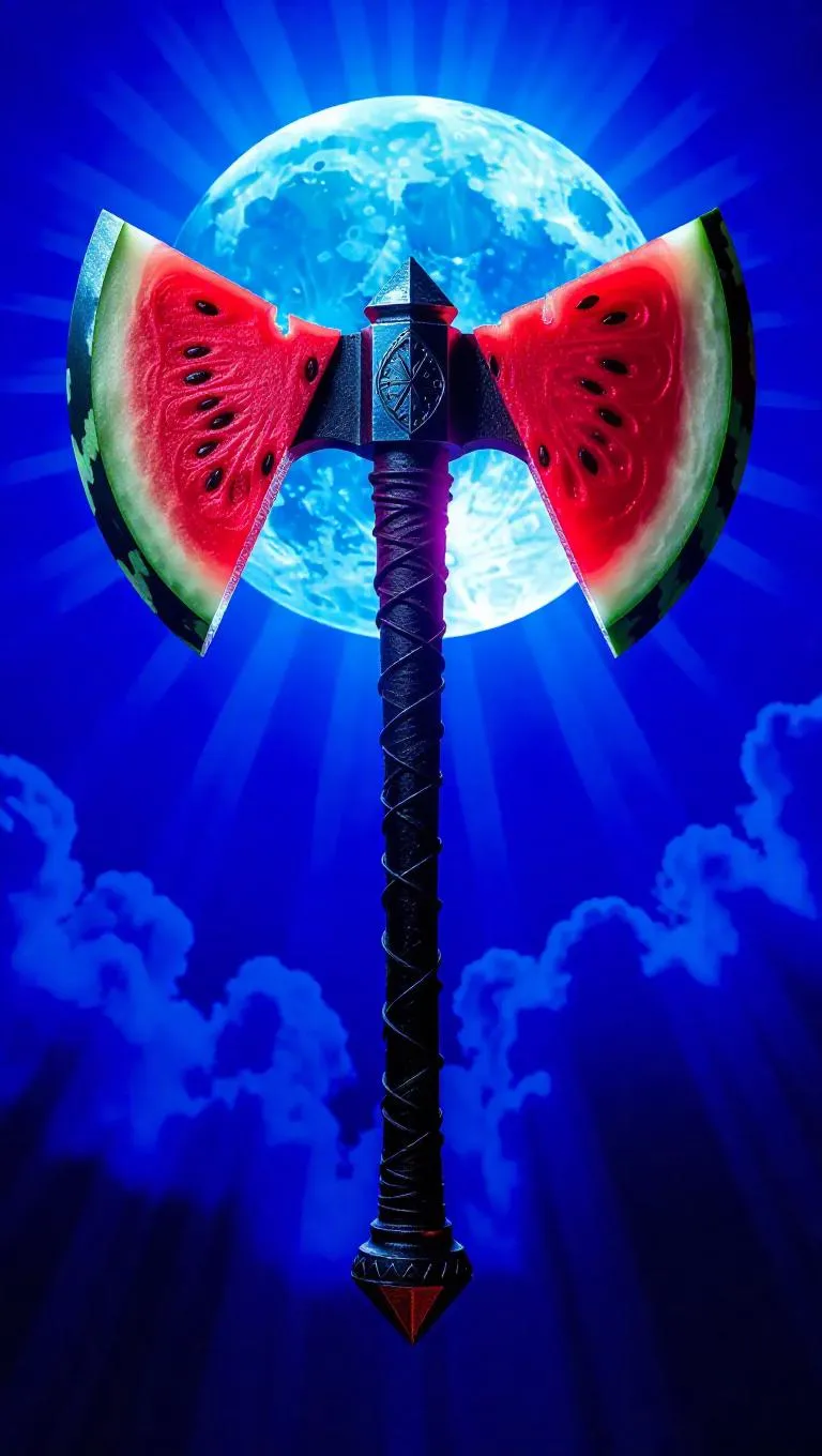 A large battle axe with a watermelon slice-shaped blade, backlit by a radiant moon, casting dramatic shadows and highlighting the intricate details of the blade. The axe is positioned against a deep blue sky, creating a powerful and mystical atmosphere.