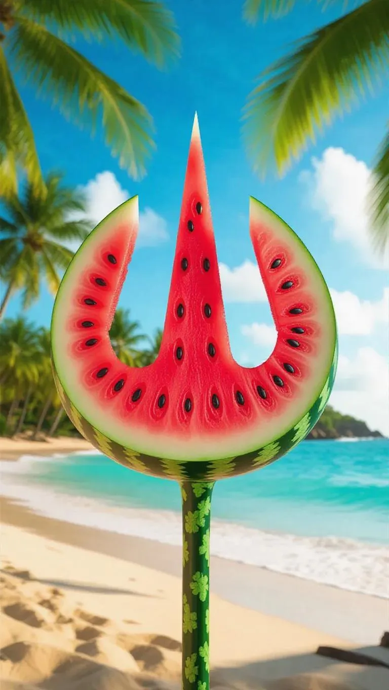 A trident intricately crafted from overlapping watermelon slices, featuring a vibrant, red core that crackles with zesty energy. The bold and dynamic design is set against a tropical beach background, with palm trees swaying in the breeze and the sun casting warm, golden light. The scene exudes liveliness and invigoration, capturing the essence of a sunny, coastal paradise.