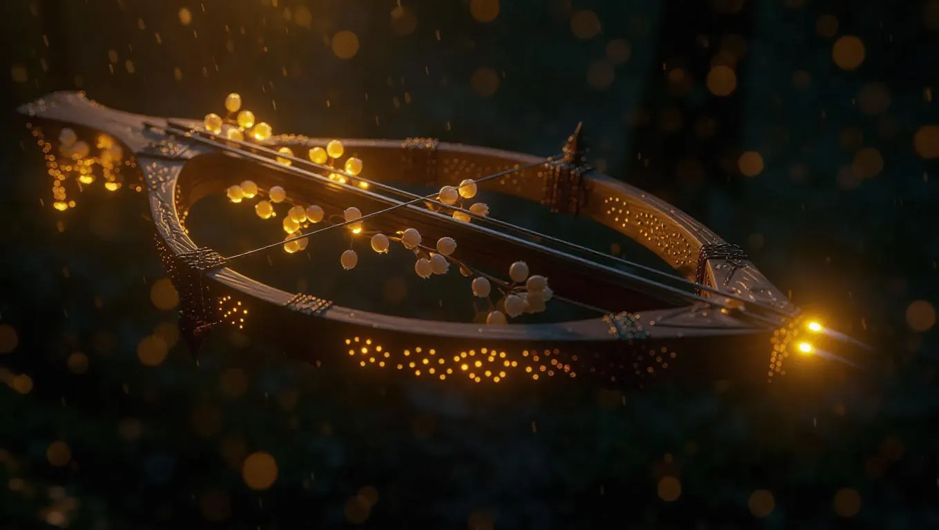 A crossbow intricately crafted from poplar wood and adorned with poplar buds, emitting a soft, ethereal warm yellow glow, set against a mystical backdrop with delicate rain motifs and shimmering light effects, enhancing the weapon's enchanting and unique design