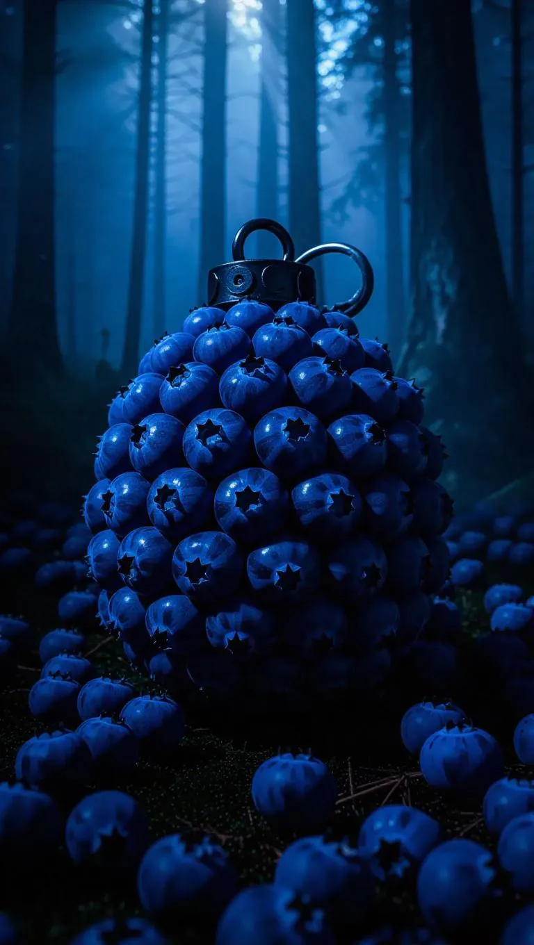 A grenade designed from clusters of ripe blueberries, deep blue and glittering in the moonlight, sits against a mystical forest at night. The forest's dense trees and ethereal glow of night highlight the grenade's elegant yet explosive design. Cool, silvery light bathes the scene, casting mysterious shadows and enhancing the blueberry grenade's dramatic color. The image style is surreal, capturing the intricate details of the blueberries and the enchanting beauty of the forest.