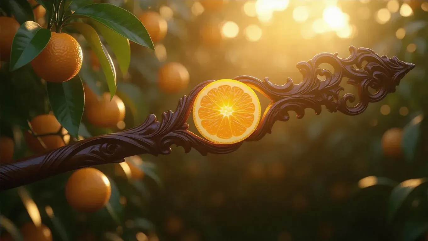A staff intricately carved from succulent kumquat slices, with a vibrant, glowing tangerine core that radiates a lively, tangy light. The staff's sleek and mystical design stands out against a vibrant citrus orchard background, enhancing its organic elegance. Soft, diffused afternoon light filters through the branches, casting gentle, lively shadows and highlighting the staff’s intricate details. The scene exudes a serene, fruity beauty, capturing the essence of a mystical, enchanted orchard.