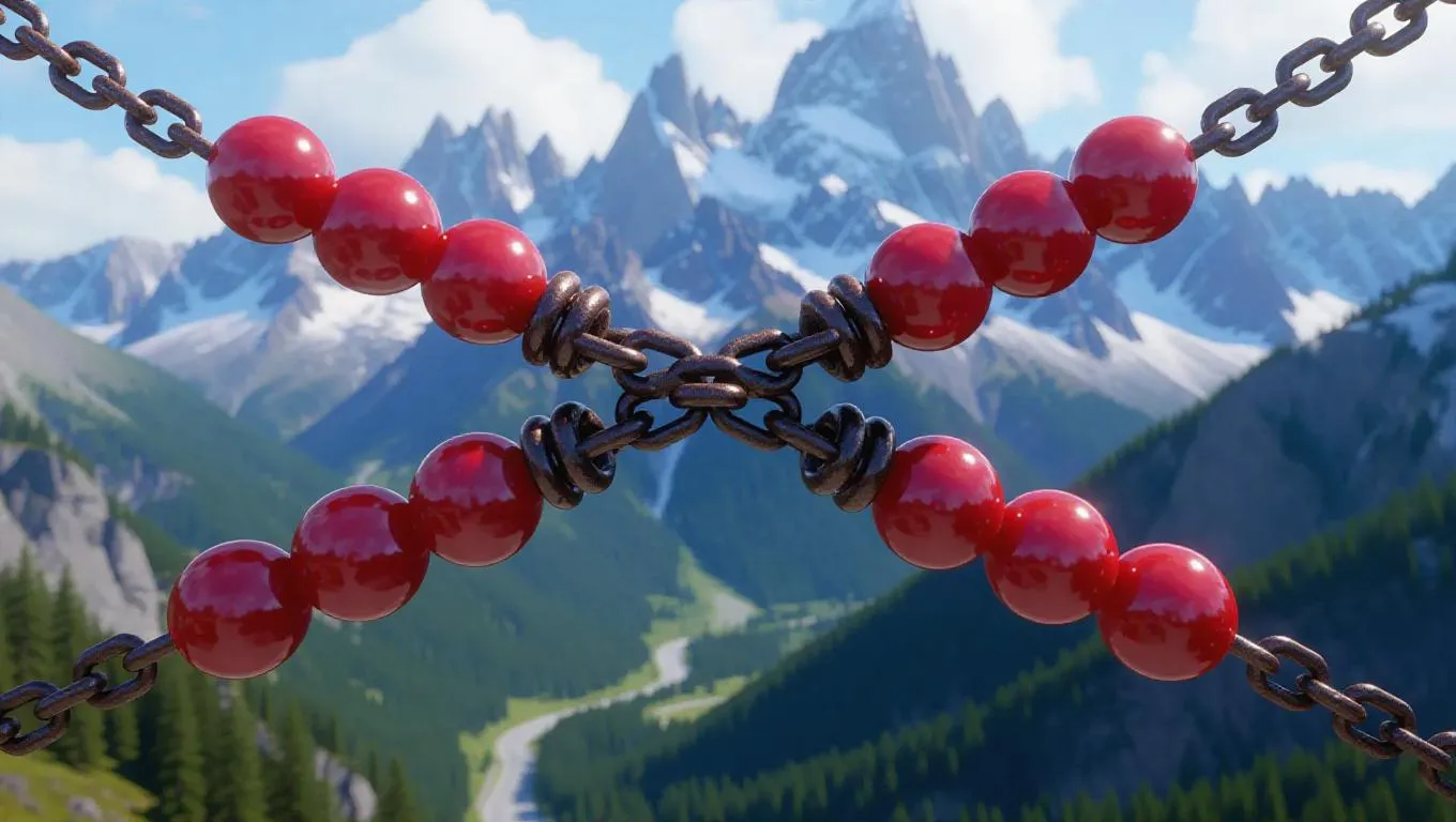 A pair of nunchucks crafted from vibrant, glossy raspberries, connected by a rusted, heavy chain, set against a dramatic mountain range backdrop, exuding a blend of whimsy and precision, perfect for concept art.