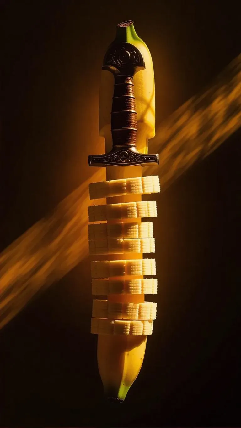A unique machete crafted from vibrant banana slices, illuminated by a warm golden light, set against a simple, soft shadow background, creating a surreal and artistic composition.